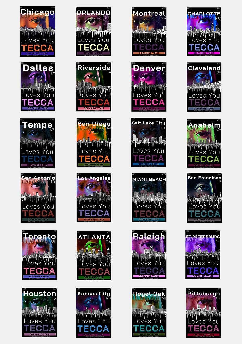 I created a set of tour-stop posters, each anchored by the eye motif that appears throughout Lil Tecca’s "Dark Thoughts" video and accompanying merch, establishing a consistent visual identity across the series.